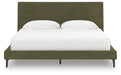 Nostalgic style, retooled for today’s trends. This king upholstered bed puts an elevated twist on mod aesthetics. Its chic sage green hue reflects the mid-century vibes you love, while the low profile incorporates contemporary motifs. Roll slats round out the design with added convenience, eliminating the need for a box spring. With this bed, you can build your bedroom into a modern haven with a touch of retro-cool flair.
