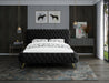 Surround yourself in modern luxury when you add this Delano Bed to your bedroom oasis. Sumptuous by design, this bed features all-over button tufting for a look that is nothing short of stunning. This dimensional bed features a heavily padded headboard and side rails, each covered in magnificent-to-the-touch velvet for a look that's upscale and simply divine. Metal legs on this bed allow easy clearance for vacuuming, and the bed uses just a mattress, so there's no need for a box spring or foundation, which only adds to its sleek look.