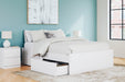 | Details | Includes platform bed panels, platform rails, roll slats and 2 side storage drawers, Made with engineered wood (MDF/particleboard/plywood) and decorative laminate for the right balance of affordability and durability, Solid white finish, Decorative laminate replicates natural or man-made material surfaces with consistent color, pattern and texture, 2 smooth-gliding storage drawers with ball-bearing side glides; vinyl-wrapped sides and back for durability, Bed does not require additional foundation/box spring; accommodates most zero clearance adjustable bases with the addition of a bunkie board, Mattress available, sold separately, Assembly required | |