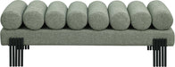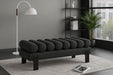 Revitalize your seating area with this stunning Akeela linen textured fabric bench featuring a rolled cushion top. Upholstered in rich linen textured fabric, this bench delivers both comfort and sophistication and features matte black metal legs to provide sturdy support while adding a modern touch to its art deco design. An ideal addition to an entryway, bedroom, or living room, the bench redefines your space with timeless charm.