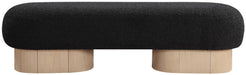Delve into opulence with this Robertson boucle fabric bench, a luxurious blend of comfort and timeless style. Draped in sumptuous black boucle fabric upholstery, this handsome bench exudes modern charm, so you can sit in style while pulling on boots or putting on shoes. The bench is adorned with a rich natural oak finish base, enhancing its classic appeal with an art deco design that infuses vintage elegance into your decor in the entryway, bedroom, or living room.