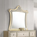 This Lucienne beige velvet upholstered wall mirror showcases a very unique and attractive design. The mirror flaunts a crown top frame with nailhead trim. The LED feature is handy when getting ready for the day, it is incorporated with mounting hardware for easiness of hanging the mirror onto the dresser. This is a must-have piece of mirror. The dresser is sold separately.