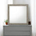 A fresh take on farmhouse design the Mari bedroom collection offers a sleek transitional design aesthetic. The bedroom set is finished in a stylish light gray with black accents that can appease anyone. The bed features a chevron-paneLED headboard and sits on black wooden legs. All the casegoods offer storage drawers with contrasting black metal pulls and sit on black wooden legs to match the bed. The dresser mirror is encased in a wooden frame to match the dresser.