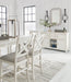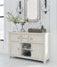 Details Made with rubberwood solids, ash veneer and MDF substrates, Antiqued white finish with wood grain texture, 4 cabinets; lower cabinets each have single adjustable shelf, 2 smooth-gliding drawers, Satin nickel-tone hardware, Top surface and cabinet doors with planked effect
