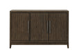 The Cityscape Dining Server / Buffet offers both style and practicality, making it an ideal addition to your dining room. Crafted from a blend of resilient Rubberwood solids, manufactured woods, and real Oak veneers, this sideboard showcases the natural beauty of wood while ensuring long-lasting durability. The sleek lines and dark walnut finish give it a modern, industrial-inspired aesthetic that fits seamlessly into a variety of décor styles. Behind the cabinet doors, you'll find two large drawers perfect for storing linens and flatware, along with spacious open shelving designed to hold china and larger dining essentials. This server provides ample storage while maintaining a refined and sophisticated look, perfect for any dining space.
