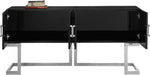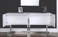 Ensure the items you need at mealtime are close at hand with this handsome Beth Sideboard Buffet from Meridian Furniture. This indispensable piece is a modern marvel with its contemporary design featuring lacquer with a stainless steel trim and base. Open the doors to reveal a large area that's suitable for storing everything from serving bowls to out-of-season dinnerware.