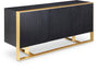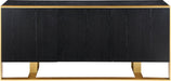 Lend glam to the dining area with this Sherwood sideboard buffet. This uber contemporary design features a contrasting color scheme with black oak wood veneers trimmed in brushed gold with a gold iron base. Crafted from solid wood and metal, this handsome unit features two shelves behind three doors for storing and organizing items you use most in your dining space, from dishes to serving pieces and more.