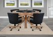 Transform your game room or dining area with this versatile 5-piece set. The round table features a reversible top—one side offering a smooth wood surface for everyday dining, and the other side designed for game nights with felt lining, built-in cup holders, and chip slots for up to eight players. Four rolling armchairs with cushioned seats provide comfort and mobility, combining function and style for any gathering.