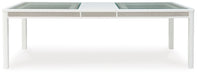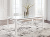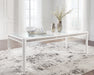 Details Made with solid wood components, MDF substrate and decorative PVC laminate, Bright white lacquer finish, Tabletops feature rhinestone and textured PVC framing with glass panels, Rhinestone accent trim, Seats up to 10, Removable center leaf, Table extends by pulling both ends and dropping in leaf, Assembly required