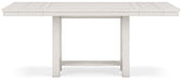 Details D642-32: Made with rubberwood solids, ash veneer and MDF substrates, Antiqued white finish with wood grain texture, Tabletop with planked effect, Two 12” extension leaves, Table extends by pulling both ends and dropping in leaf, Assembly required, D642-124: Made with wood, Antiqued white finish with wood grain texture, Foam cushion with polyester upholstery, Nailhead trim, X-back, Assembly required,