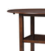The small space friendly Gia Counter Drop Leaf Table and Chair Set has two 8" drop down leaves that transform this dining table from a 42" round dining set to 24" wide, fitting into compact spaces with ease. The counter table and chair legs are crafted of solid Rubberwood to add strength and stability. Elegant reverse diamond Mindi wood veneer dining table top accents the beautiful wood grains which are highlighted by the multi-step traditional brown cherry finish The set includes two comfortable counter height chairs with 100% polyester upholstered seat cushions and backrests, and wood footrests. The final touch is Gia's signature interlocking chain design on the chair back, giving this welcoming dining set a touch of sophistication. The result is a casual, contemporary counter dining set that ideal for dining rooms, kitchen nooks, dorms or game rooms.
