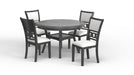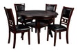 The elegant Gia 5 Piece Dining Table and Chair Set is built with durability and comfort in mind. This dining set provides spacious seating for four, and a handy storage shelf located under the table top to store dinnerware or decor. The dining table apron, table legs and dining chair legs are crafted of solid Rubberwood to add strength and stability. The distinctive reverse diamond Mindi wood veneer dining table top accents the beautiful wood grains which are highlighted by the multi-step finish, with just a touch of red for richness. The set includes four comfortable dining chairs with pu upholstered seat cushions and backrests. The final touch is Gia's signature interlocking chain design on the chair back, giving this welcoming dining set a touch of sophistication. The result is a casual, contemporary dining set, perfect for your dining room or kitchen.