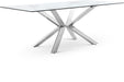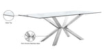 The Juno Dining Table by Meridian Furniture. Featuring a beautiful contemporary design with chrome plated stainless steel base and Genuine glass top. This dining table is guaranteed to be the highlight of any home.