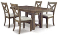 This dining room extension table elevates the art of casual rustic style. Clean-lined, farmhouse profile is beautified with a distressed nutmeg finish and thick planked effect top for added charm. And with not one but two drop-in leaves, you can easily accommodate eight with plenty of elbow room.