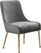 Revamp your dining space with this Owen Dining Chair. Posh velvet upholstery covers every inch of this chair, giving it a svelte look that's just the thing for modern decor. The polished legs have a ball design for added visual oomph, and a matching handle on the back adds an elegant detail while also providing an easy way to slide the chairs in and out from your choice of table.