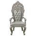 Indulge in the allure of these exquisite Sandoval armchairs and experience the comfort and elegance it brings to your living space. The chair's carved legs showcase intricate detailing, adding a touch of refinement and artistry. The craftsmanship of the carved legs creates a sense of timeless beauty and enhances the chair's overall aesthetic. The button-tufted backrest is a standout feature of this side chair. Each tuft is adorned with sparkling crystal-like buttons, creating a stunning visual effect that adds a touch of glamour and luxury. The button tufting not only enhances the chair's elegance but also provides plushness and support for your back. Upholstered in synthetic leather, the chair exudes sophistication and offers a smooth and luxurious feel. The synthetic leather provides a durable and easy-to-clean surface, making it practical for everyday use while maintaining its refined appearance. Adding a regal touch, the chair boasts an elaborately carved crown on the backrest. This ornate crown showcases intricate patterns and adds a touch of grandeur and sophistication.