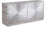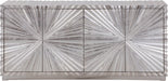 Keep the things you use most handily nearby inside this Silverton sideboard. This lovely sideboard/buffet is just the thing to bring organizational power to your dining area. Open its doors to reveal a shelf area for neatly stacking everything from dining room linens like tablecloths and napkins to out-of-season dinnerware or serving pieces. An all-over silver leaf finish adds an elegant touch to the buffet, and its hand-carved sunburst details add a refined finish.