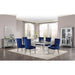 Let the Varian dining collection reflect your brilliant style! This chic set features a rectangular table accented with a beveled mirror trim in a geometric design. The matching chairs are upholstered in a lustrous blue fabric and supported by elegantly tapered legs with mirror inlay for an extra sparkle. Complete the set with the optional server or curio for a transitional glam dining space that's sure to impress!