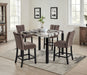 Contemporary and chic, this counter height dining group features a striking faux marble top that brings a polished, upscale feel to any dining area. The sleek, black-finished legs provide bold contrast and strong support, while the cushioned chairs are wrapped in smooth, mocha-toned upholstery for a warm and inviting look. Designed for both comfort and style, this set is ideal for casual dinners, morning coffee, or lively gatherings, offering a refined centerpiece that complements modern interiors with ease.