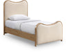 Sleek lines and soft curves come together in the Arvada vegan leather upholstered bed, where warm tones and a sculptural silhouette create a modern yet timeless centerpiece. Wrapped in smooth vegan leather and supported by a solid wood base in a natural finish, this bed balances comfort and craftsmanship with ease. Perfect for adding a grounded, organic feel to any bedroom.