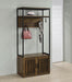 Your functional living space keeps clutter away with a rustic hall tree offering ample room for storage. Perfect for a transitional entryway or mud room, this hall tree features a lower cabinet and upper board made of rich dark pine finish wood products. Industrial inspiration adds black finish metal framing in a linear mode, adding an upper shelf for storage and a tray surface above its cabinet. Find four shelves behind two cabinet doors, ideal for concealing shoes and accessories. Hang coats, hats, and scarves on seven hooks, making them accessible with a quick reach.