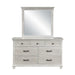 The Silver Sands Mirror showcases durable, quality construction, crafted from solid pine and oak wood veneers for a beautifully framed piece. Its transitional style blends clean, simple lines with a rustic wood finish, creating a calm and inviting atmosphere. The misty gray finish, meticulously applied in multiple steps, gives a light, weathered look that highlights the wood's natural grain and mineral patterns. Elegant design elements, including a nicely shaped crown and dentil moldings, add a sophisticated touch. The low-distortion mirror ensures a clear, accurate reflection, making it a practical and stylish addition to any room. Combining functionality and elegance, this mirror enhances both traditional and modern decor styles.