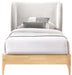 Bestow midcentury modern charm to your bedroom retreat with this lovely Ventura fabric bed. A winged headboard adds an elegant touch to the design of this handsome bed, and upholstery in a soft neutral color makes it easy to integrate the bed with other furnishings. Solid wood legs in a natural finish form a contrast that enhances the bed's overall aesthetic. So use it with or without a box spring as desired.