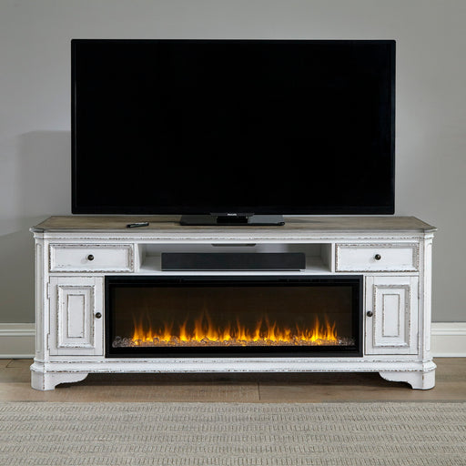 Liberty FurnitureGet cozy with the Magnolia Manor eighty-two inch console with fire. Crafted with excellence using rubberwood solids with birch veneers, this piece ...