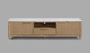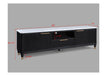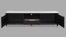 This entertainment console brings modern luxury and sleek sophistication to any living space. Featuring a striking contrast, fluted wood facade with a pristine faux marble top, this piece embodies refined elegance. Brass-tone accents and tapered legs add a touch of mid-century flair, enhancing its chic, upscale appeal. With generous storage space behind its textured doors and an open center shelf for easy access to media components, this console is as functional as it is stylish. Ideal for contemporary interiors, it’s the perfect blend of high-end design and everyday practicality, making it a standout addition to your home decor.