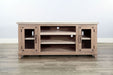 Anchor your living room or media space with this entertainment console, blending rustic charm with functional design. The lightly wire-brushed wood finish brings a relaxed, farmhouse feel, while the glass-front cabinet doors add a touch of sophistication. Open center shelving offers the perfect spot for media players and decor, with cutouts for easy cable management. Whether you're displaying your favorite movies or organizing electronics, this piece combines style and storage in one cohesive look.