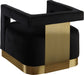 Liven up your living quarters with this unique Armani Accent Chair from Meridian Furniture. Featuring a square frame design with right angle openings at the arms and back, this chair puts the "mod" in modern. velvet upholstery gives the chair a soft, comfy texture that you'll want to get cozy with, and its steel base and back complements its dark upholstery while providing solid support. This chair is the perfect addition to any room in your contemporary home.