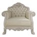 Introducing one of our most famous collections, Dresden in a new antique pearl white finish. This chair has a classic feel, featuring decorative carvings throughout the frame, that create a classic piece. Sitting on claw feet for style and stability. It is hand-brushed with silver accents that make the carvings pop. Upholstered in luxurious synthetic leather for a modern touch. The backrest is button tufted with crystal-like buttons for glamour and drama. Finished off with classic nailhead trim. Two throw pillows are included.