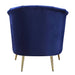 This Eivor trendsetting collection will add style and color to any room. The collection features soft feminine curves and channel tufting to create a modern home. Upholstered in a sumptuous blue velvet that is classy and bold. The metal legs and wooden inner frame make for a sturdy piece that will last for years to come. The sofa is ideal for leaning back and relaxing in style. Expand your seating area with the matching chairs.
