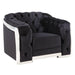 A classic chesterfield design with a modern twist, the Pyroden collection can work in both modern and traditional decor. Both glamourous and cozy with their overstuffed cushions and button-tufted backrest and arm. The outer body is accentuated with diamond stitching to give them more pizzazz. The metal trim is a contemporary feature that makes the black velvet stand out.