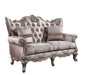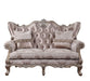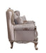 The Jayceon loveseat is gorgeous, with shimmery fabric upholstery that highlights the champagne finish of the wooden frame. Button-tufted seatbacks wing out under carved arches. Loose seat cushions are upholstered in a floral patterned fabric that extends over rolled arms. A scrolled floral motif adorns each piece in this addition to Acme's exclusive design collection.