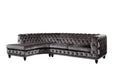 A modern take on traditional design, this Atesis sectional is a statement - making piece of beautiful design. Rich dark gray velvet is tufted on both the inside and outside of the frame, a beautiful design detail that can be seen from any angle in a room. The seat cushions allow for comfortable multi person seating with lots of room to stretch out and relax. Suited for both traditional and contemporary design environments