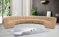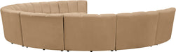 Create a seating group that works for every possible situation with this Infinity modular 9-piece sectional and other pieces in the Infinity collection. Upholstered in soft Camel velvet material that feels great against the skin and offers long-wearing beauty, this piece fits with other Infinity items for an infinite number of combinations that get your seating requirements just right but that look just as nice when used on their own.