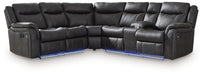 This reclining sectional pairs the luxe look of faux leather with must-have functional features. LED lights on the underside put a modern twist on the simply chic design—choose from three colors to add ambiance to movie night or gaming with friends. And you can keep remotes, drinks and other entertainment essentials close with the handy console. Ready to relax? Easy pull tab reclining has you stretched out in no time.