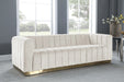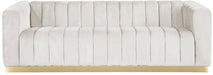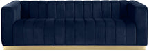 Seat guests in the epitome of comfort and style with this Marlon velvet sofa. This piece is just the thing to showcase your modish style while ensuring total enjoyment from all who are lucky enough to relax on its channel tufted seats. The soft velvet upholstery adds a beautiful touch to your space and feels great against your skin while the brushed gold stainless steel base lends it a contemporary finish.