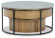 | Details | Set includes lift-top coffee table and rolling storage trunk, Made with oak veneer and engineered wood, Light, natural finish, Metal frame with black finish, Coffee table with faux cement melamine top; lift-top mechanism, MEGA-TUFF® melamine surfaces are made of easy-clean melamine which is heat-, scratch-, water- and stain-resistant, Nesting design storage trunk with casters for easy mobility, Assembly required | |
