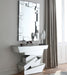 Elevate your interior with this Jade console table. This handsome table features a staggered geometric base that makes it look more like an intricate sculpture than the actual piece of furniture it is. Every surface of the base is mirrored, so it reflects light and adds spacious appeal and dimension to your space. The top is made from thick glass and amply sized to hold collectibles or photos.