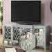 The Kacia console table will be a stylish addition to any living space. Features four mirrored front doors beautifully embellished by raised ornamental inlay, each door includes one shelf inside. This versatile piece may be used as a TV stand, display table, or storage cabinet for any room essentials.