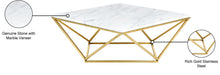 The Mason table, by Meridian Furniture. Featuring a beautiful contemporary design. Constructed of gold finished stainless steel and solid stone top, it's guaranteed to be the highlight of any room.