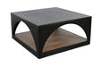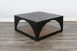Striking and sculptural, this modern coffee table brings architectural flair to any space. The bold black frame is accented by a natural wood shelf, artfully suspended within a carved arch cutout for a dramatic yet minimalist look. With its open design and clean lines, this piece is perfect as an entryway table, media stand, or display shelf in a contemporary or transitional home.