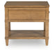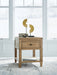 Taking a timeless approach to casual beauty, this end table brings easygoing elegance to the everyday. The light brown wood-tone finish seamlessly slips into your room’s aesthetic. A dark bronze-tone pull accents the drawer, adding to the table's fresh approach to transitional stylings. And built-in USB charging makes scrolling while lounging on the sofa that much more convenient.