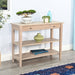 The wood table with two shelves and one drawer is a versatile and elegant piece of furniture that effortlessly blends form and function. Crafted with attention to detail, the table's design strikes a harmonious balance between simplicity and sophistication. The spacious top provides an ideal surface for displaying decorative items or serving as a convenient spot for everyday essentials. Two open shelves below offer additional storage or display options, allowing for a touch of personalization in styling.