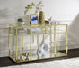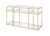 Modern simplicity makes your space feel uncluttered and stylish. The Uchenna Sofa Table has a brilliant color and lustrous finish to enhance it's sleek modern silhouette. Metal table frame in a gold finish exudes lustrous shine, topped with tempered glass to bring a glamorous-yet-modern flair to this piece. The Uchenna Sofa Table really makes a style statement. Shape up your space with this voguish accessory.