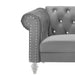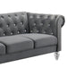 The New Classic Emma Chesterfield Velvet 3 Seat Sofa is a blend of soft elegance and sophisticated design. Crafted from 100% polyester velvet fabric, it offers cozy and indulgent seating for three. The glam tailoring features tufted backs and arms adorned with glimmering crystal buttons, adding a touch of luxury without compromising comfort. Upscale accents, including silver nailhead trim on the rolled arms and silver turned bun feet, enhance the velvet fabric. Shipped unassembled for easy placement in any home, its lower profile height makes it small space-friendly, fitting well into smaller rooms while providing full-size seating. Enjoy supportive seating with full foam cushions that provide ample comfort. Add a little sparkle in your home with the Emma Sofa.