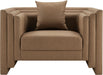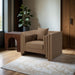 Soft tan vegan leather and a bold, structured silhouette give the Everett chair a modern edge. Cushioned with plush pillows and built with a solid wood inner frame, it's designed for both style and comfort. Perfect for elevating any room, this chair creates a striking focal point while inviting you to sit back and relax.