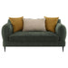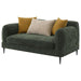 Enhance your living space with the modern elegance of this loveseat, designed to offer style, comfort, and functionality. Its sculpted round shapes and bench waterfall seat cushion provide a harmonious and inviting look, making it a perfect addition to any room. The loveseat is upholstered in textured chenille fabric, which is incredibly soft to the touch and adds a layer of luxury and durability. The rich green hue, paired with vivid yellow and neutral beige accent pillows, creates a balanced and vibrant look. Thin, tall metal legs support the loveseat, giving it a light and airy appearance while adding a modern touch.
